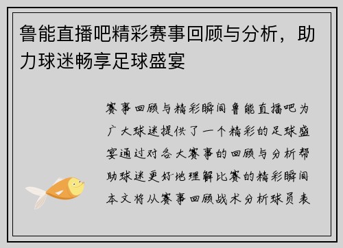 鲁能直播吧精彩赛事回顾与分析,助力球迷畅享足球盛宴