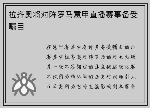 拉齐奥将对阵罗马意甲直播赛事备受瞩目