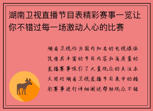 湖南卫视作为国内知名的电视媒体,凭借其丰富的节目内容和高质量的直播赛事,吸引了大量观众的关注。本文将对湖南卫视直播节目表中的精彩赛事进行详细阐述,帮助观众不错过每一场激动人心的比赛。我们将从赛事安排、赛事类型、观赛体验和互动环节四个方面进行分析,力求为观众提供全面的信息,让每位体育爱好者都能享受到赛事的魅力。